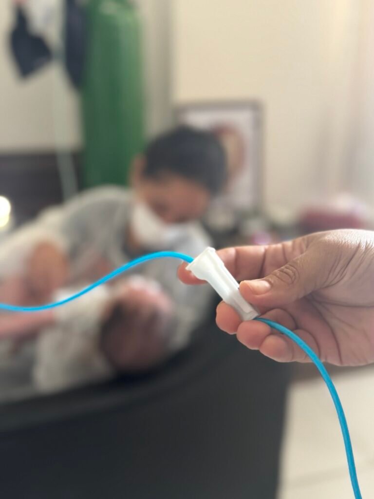 Graças a esse dispositivo, conseguimos diminuir gradualmente o oxigênio e hoje ele está com 0,5 L/min, mantendo um nível de saturação de > 95%, o que é um bom sinal.